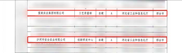 集團旗下沙河安全公司及望美實業有限公司同時入選并獲評認定為A級河北省工業企業研發機構,標志著集團自主創新水平和核心競爭力的進一步邁進提升。